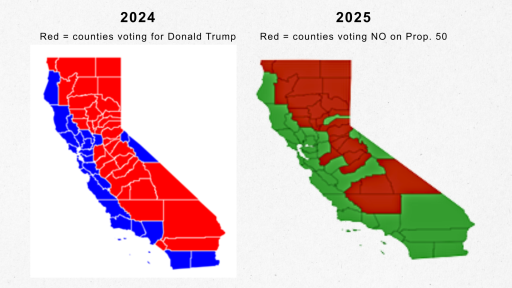 It’s a harsh truth that if all the Californians who voted to elect Donald Trump in 2024 (they officially numbered 6,081,697) had “stayed the course” and voted no on Prop. 50 just one year later, Prop. 50, with about 5.3 million YES votes, would have been defeated by a greater number of NO votes.