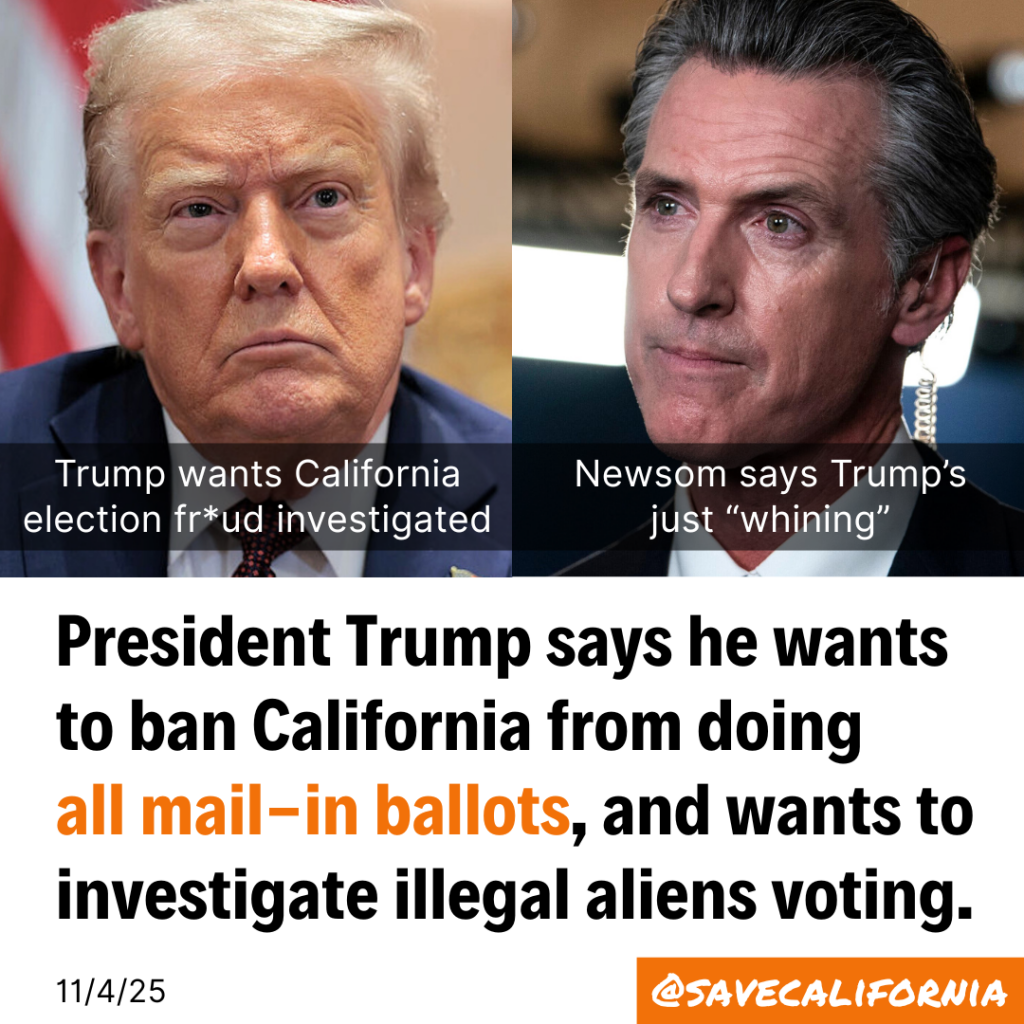 Trump’s full statement on his 11/4/25 Truth Social post: “The Unconstitutional Redistricting Vote in California is a GIANT SCAM in that the entire process, in particular the Voting itself, is RIGGED. All “Mail-In” Ballots, where the Republicans in that State are “Shut Out,” is under very serious legal and criminal review. STAY TUNED!
