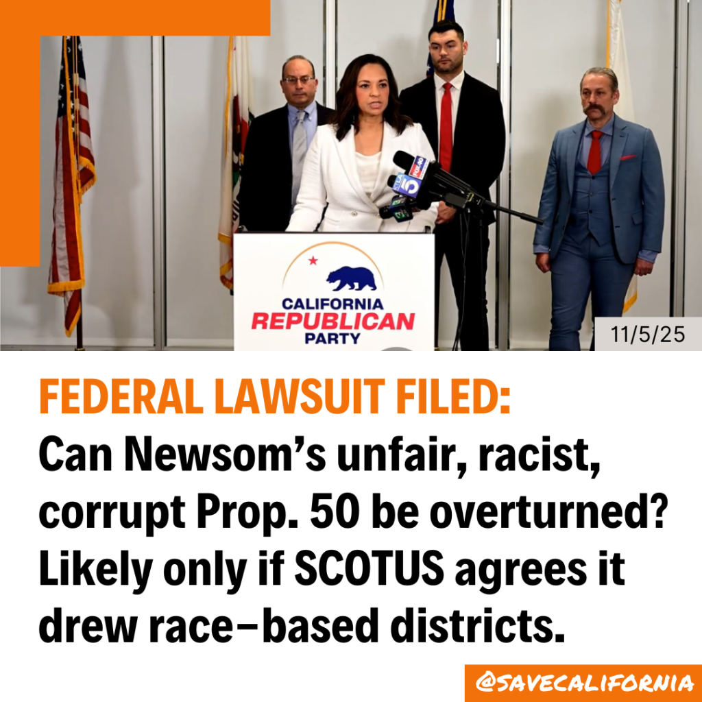 The federal lawsuit alleges Prop. 50 violates the 14th and 15th Amendments to the U.S. Constitution. The most likely chance of 5 or 6 SCOTUS judges agreeing would be the 15th Amendment’s prohibition of limiting or denying voters’ rights based on color or race.