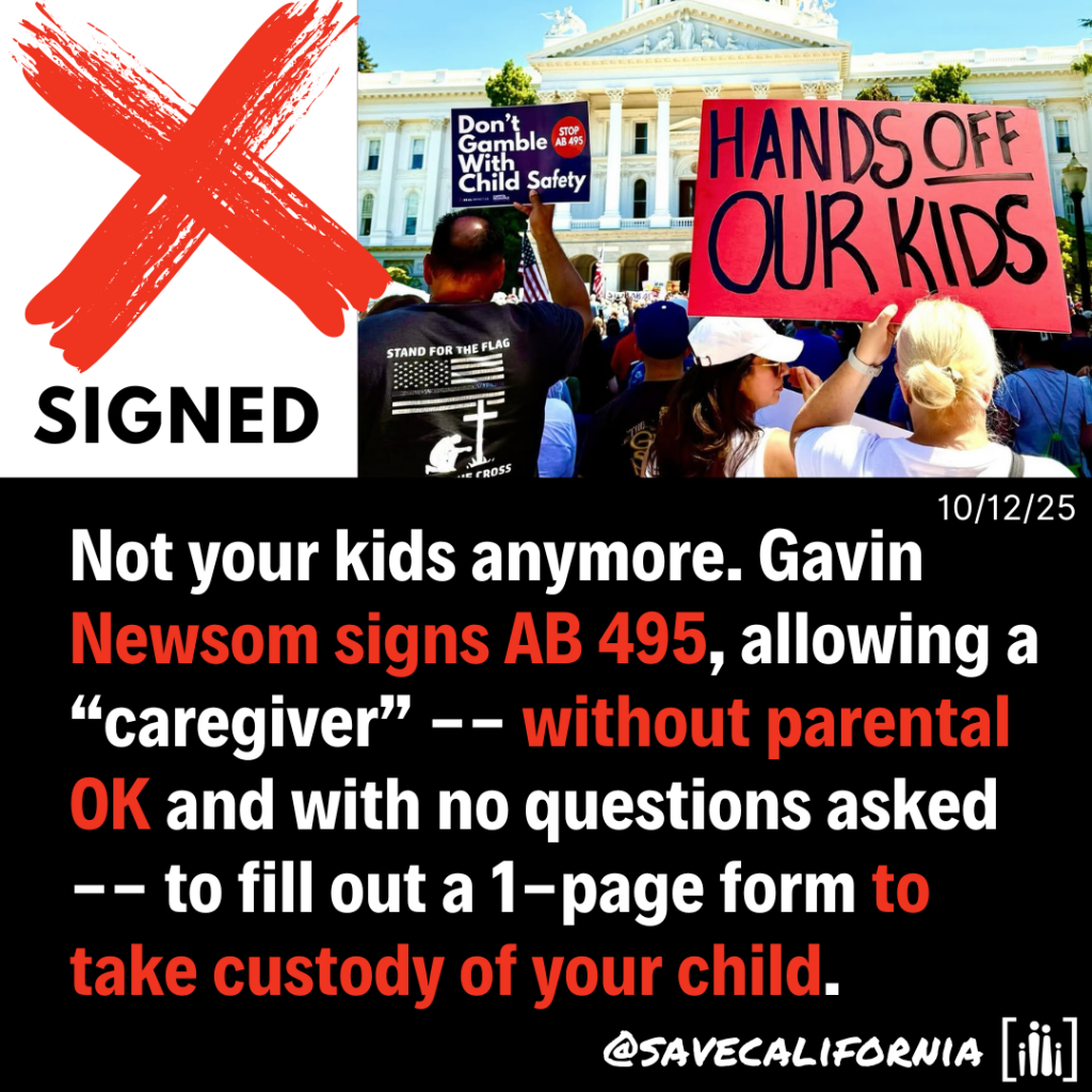 Newsom CLAIMS signing AB 495, “Helps protect parents’ legal rights and supports security for children in case they are separated from their parents due to immigration enforcement. This also supports parents’ rights in the context of a disability, military service and incarceration.”