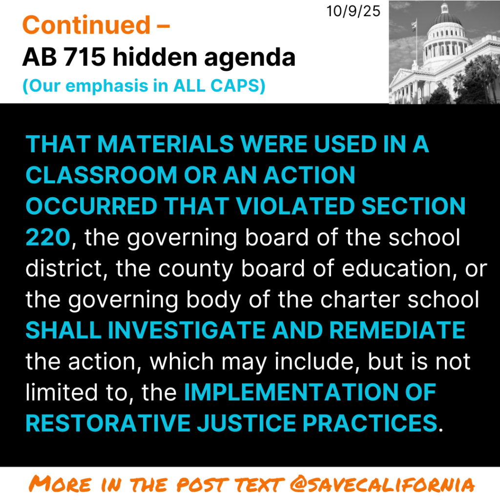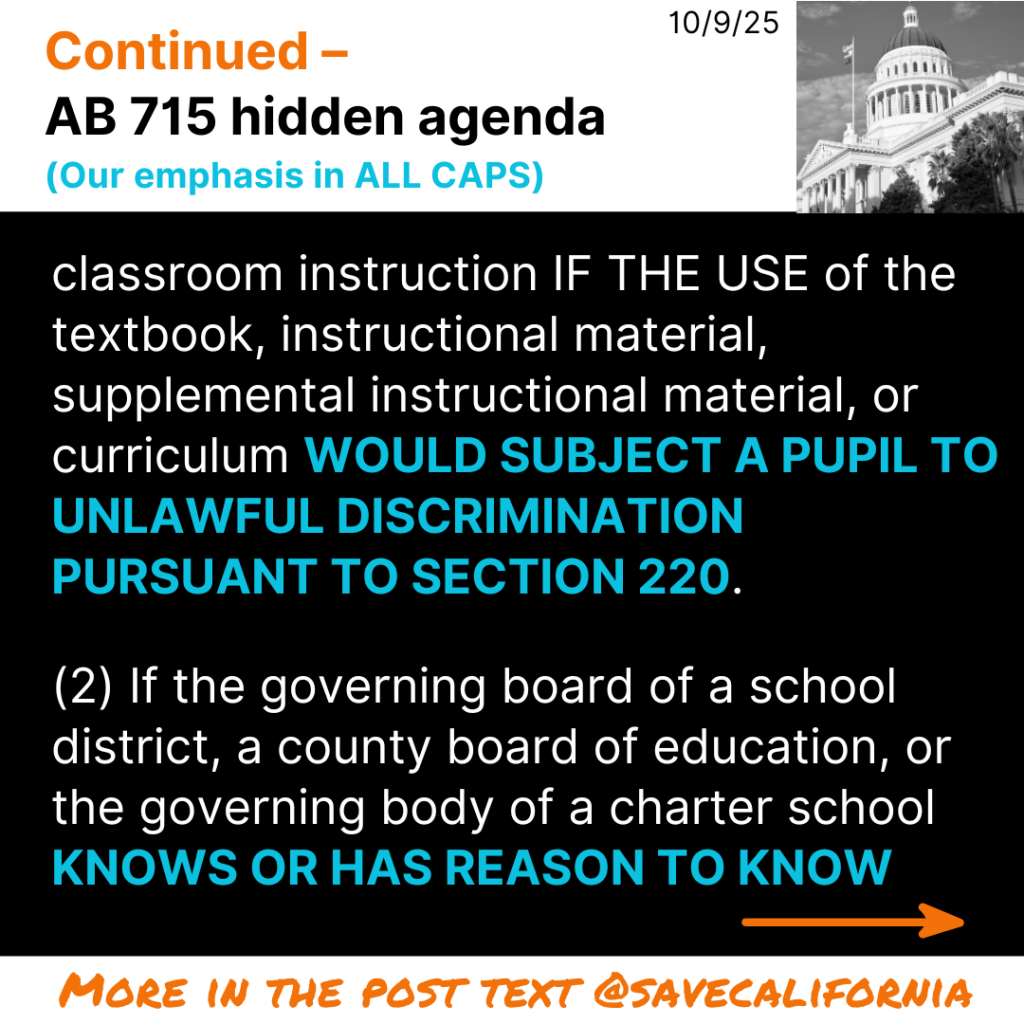 The deceptive AB 715 (a product of the so-called “Diversity Caucus”) will be used as a hammer against conservative school boards by making Education Code, Section 220, which includes and promotes “gender, gender identity, gender expression … sexual orientation” a huge eraser of anything in its path.