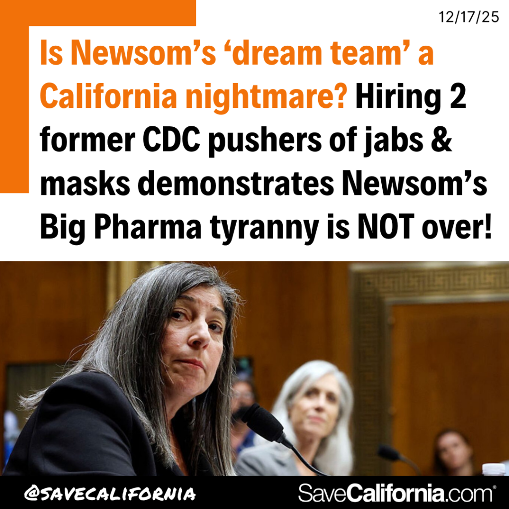 Big Democrat Gavin Newsom has hired two vaccine-addicted ladies who used to work at President Trump’s CDC. These leftists did not work for you, but for Big Pharma by ignoring the overwhelming evidence of vaccines’ lack of effectiveness and of vaccine harms.