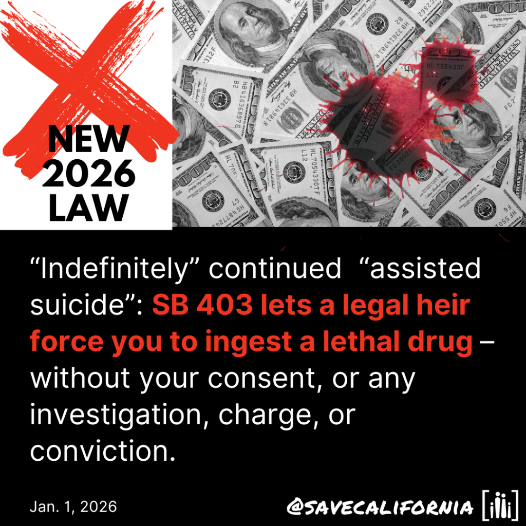 Even if you support so-called “assisted suicide,” what if it involves murder? SB 403’s continuation of California’s badly-written “assisted suicide” law doesn’t even guarantee the choice of the person. Even if there was evidence of a struggle, and even if an heir was present, police and paramedics and district attorneys are ordered to look the other way. Because under this dangerous law, no investigation or charge is allowed.