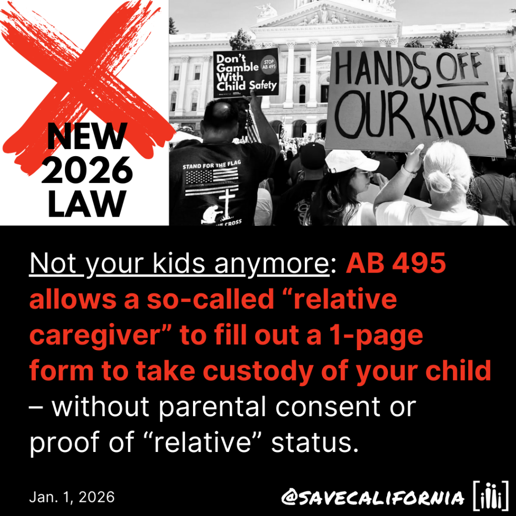 The outrageous new threat of AB 495 against impressionable children will primarily happen on government school campuses. Because parents aren’t there, and the 1-page form, which school staff must respect and obey, supersedes everything else. There is no proof of “relative” status required. For legal kidnapping to occur, all that’s needed is a compliant or confused child.
