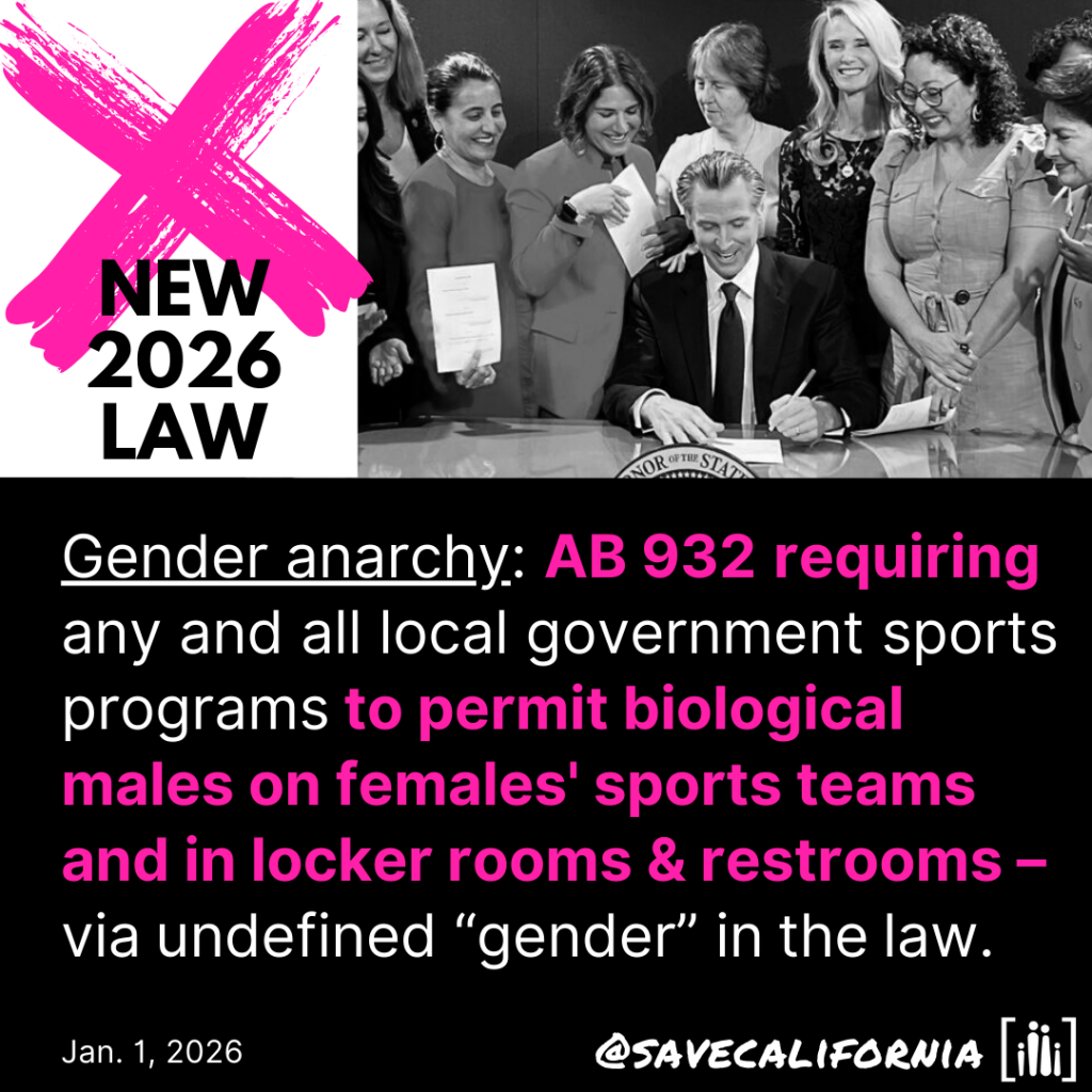 In the California statutes, “gender” already means subjective “gender identity” and “gender expression.” AB 932 takes this and prohibits “gender discrimination” in all government-run sports programs (public schools, cities, counties, etc.). Thus, the new law’s result is that biological males must be permitted to play on females’ teams and use females’ locker rooms, showers, and restrooms. And four “Republicans” joining nearly all the Democrats in voting “yes” on AB 932 shows that with Democrat Party and RINO politicians, girls lose.