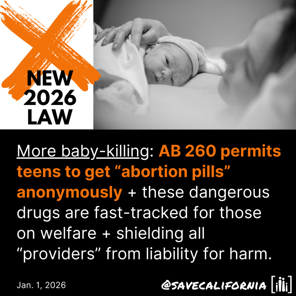 Abortion pills frequently injure women and girls — and always kill an innocent human being, the baby. Yet AB 260, intent on killing preborn babies, would require pharmacists to dispense them, permits teenagers to obtain abortion pills anonymously, fast-tracks it for welfare recipients, requires coverage by Medi-Cal and private insurance plans, and exempts pushers of abortion drugs from “civil, criminal, disciplinary, or other administrative action” — despite the resulting injuries.