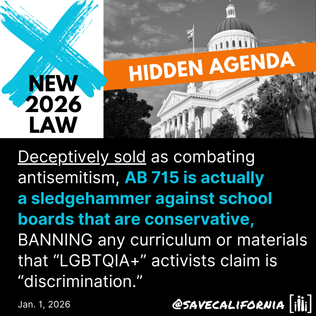 Although sold as combating antisemitism, this deceptive bill (a product of the so-called “Diversity Caucus”) is based on Education Code, Section 220, which includes “gender, gender identity, gender expression … sexual orientation.” As such, AB 715 orders K-12 “public” schools to purge any scientific teaching about human physiology and the natural family that “would subject a pupil to unlawful discrimination” (i.e., whatever “offends” LGBTQIA+ activists). In the State Legislature, most Democrats and 28 of 30 Republicans voted “yes” for this.